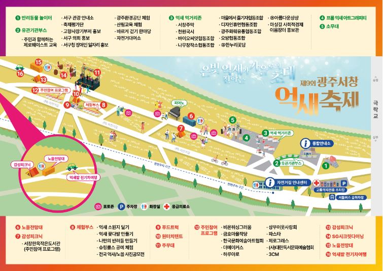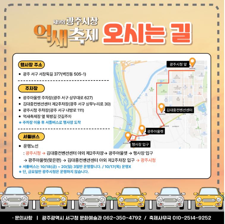 - 광주시청 -> 김대중컨벤션센터 야외 제2주차장 -> 광주아울렛 -> 행사장 입구