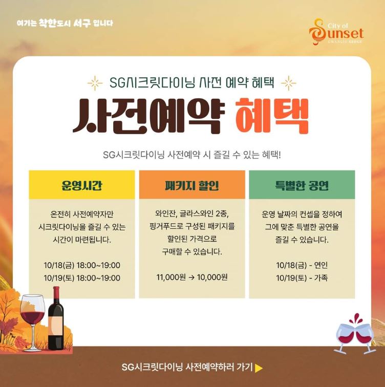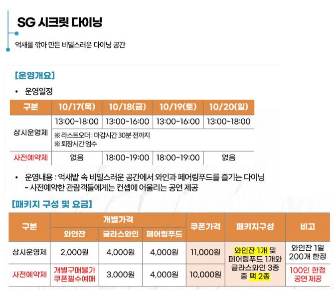 1. 운영시간 - 온전히 사전예약자만 시크릿다이닝 이용 가능(10. 18(금) 18:00-19:00/10. 19(토) 18:00-19:00)