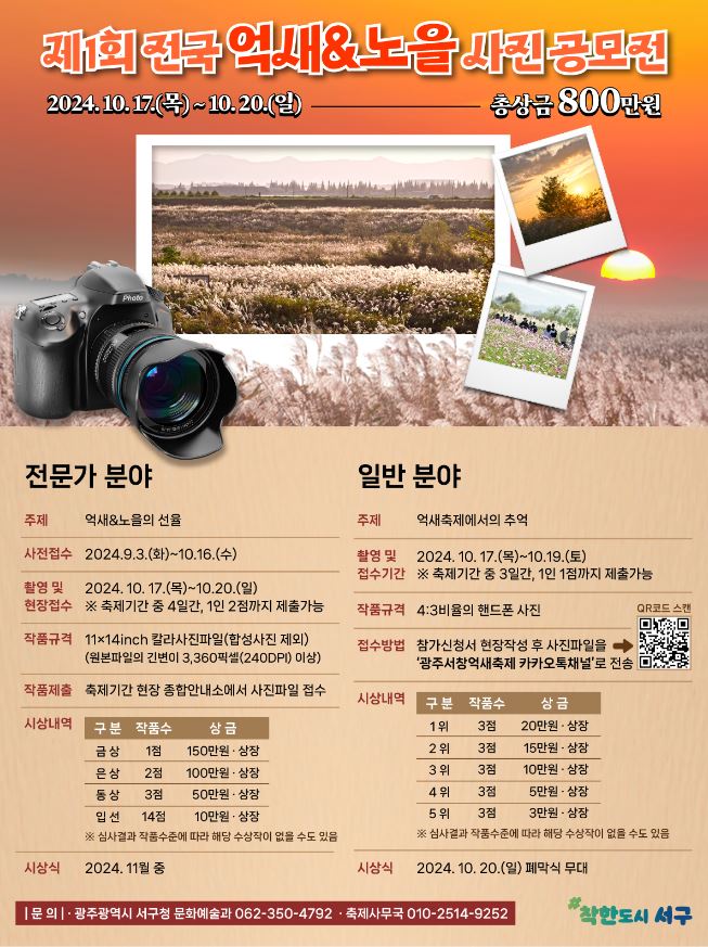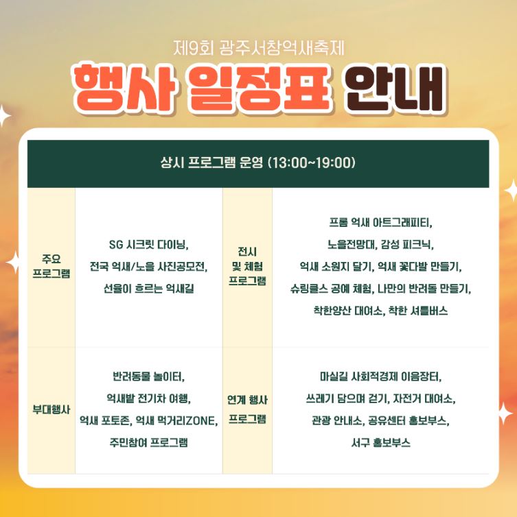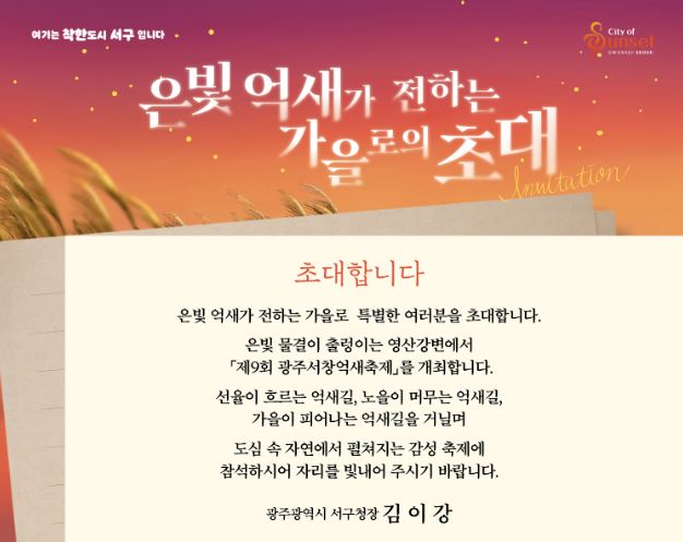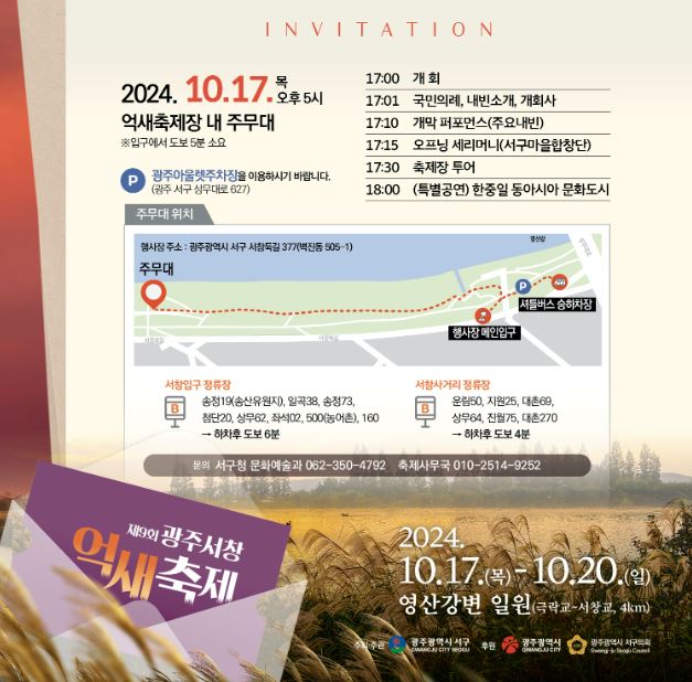 광주서창억새축제는 2015 '억새생태문화축제'를 시작으로 2024년 올해 9회째 진행하는 가을 축제입니다. 광주광역시 서구에 위치한 영상강변 극락교에서 서창교까지 4km 구간에서 진행됩니다. 다양한 볼거리 및 참여가능한 행사 프로그램들이 준비되어 있으니 광주 가볼 만한 곳을 찾으시는 분들이라면 가을 여행으로 광주서창억새축제를 추천드립니다.