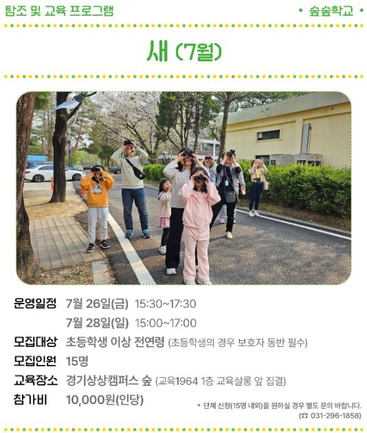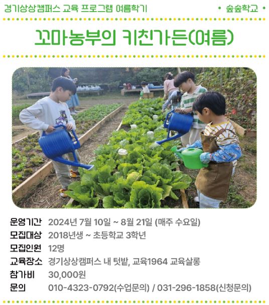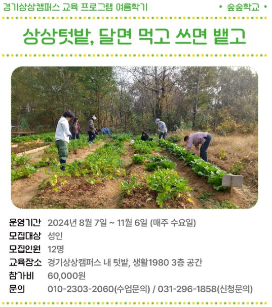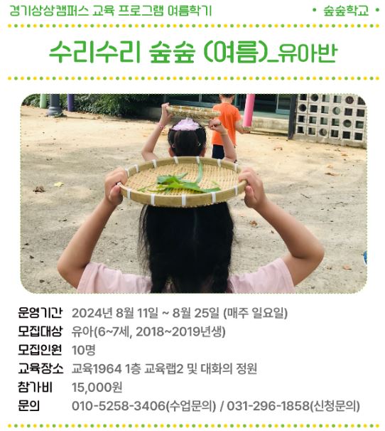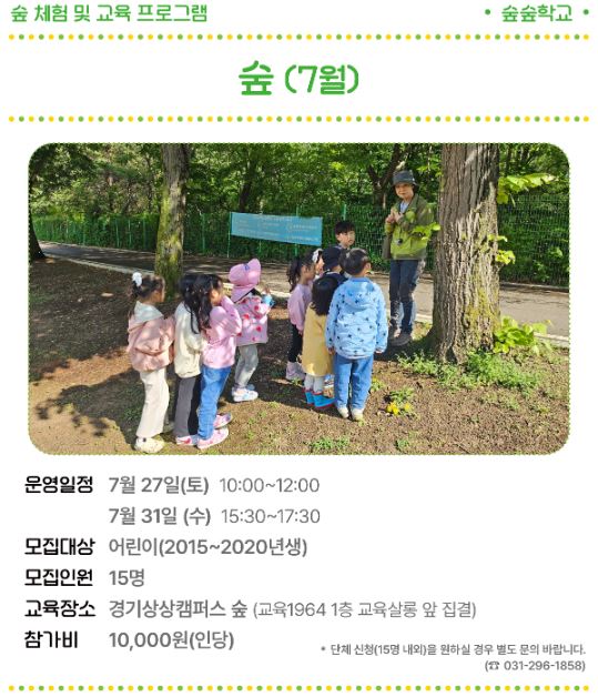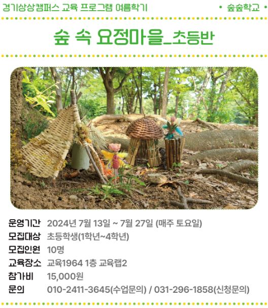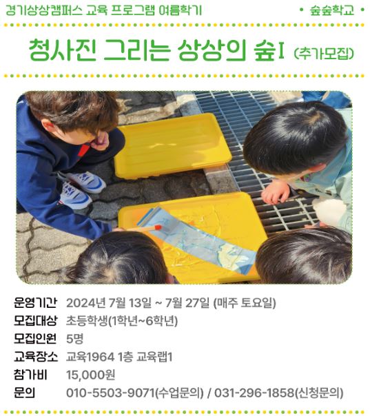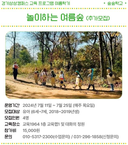 경기상상캠퍼스에서 자라나는 아이들을 위해 월별로 다양한 프로그램들을 진행하고 있는데, 경기상상캠퍼스 홈페이지에 들어가시면 월별 일정을 확인 하실 수 있습니다. 현재 놀이하는 여름숲, 청사진 그리는 상상의 숲, 새(7월), 숲(7월), 꼬마농부의 키친가든(여름), 상상텃밭, 달면 먹고 쓰면 뱉고, 수리수리 숲숲(여름)_유아반, 숲 속 요정마을_유아반/초등반 등을 운영하고 있습니다.