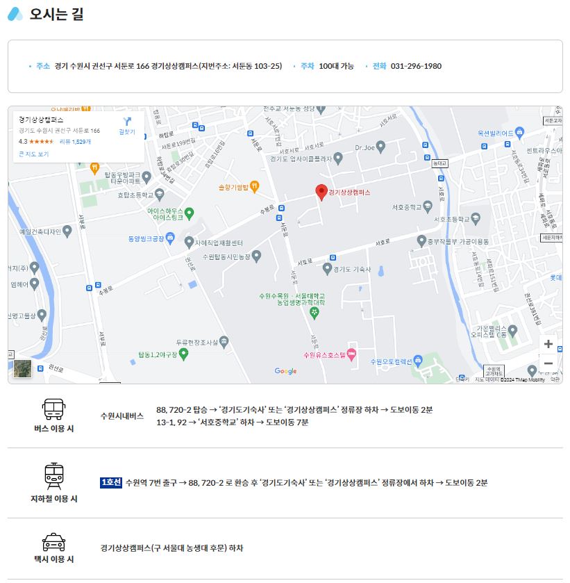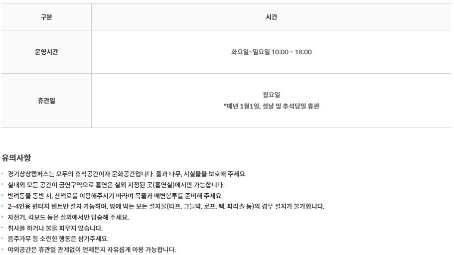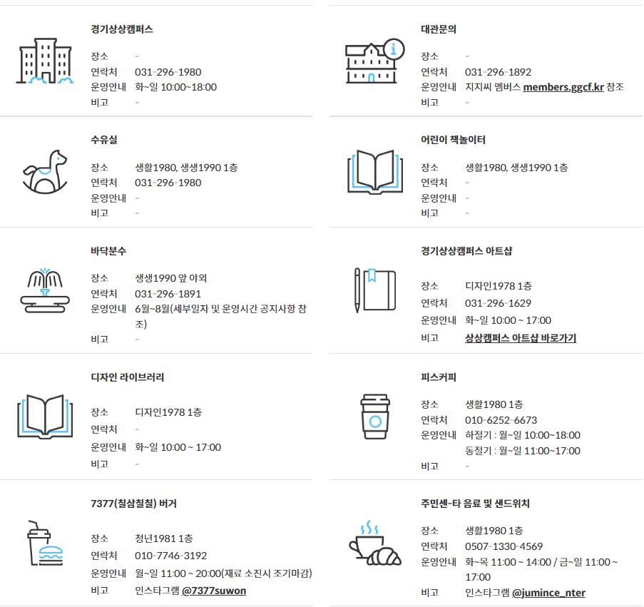 경기상상캠퍼스는 화요일에서 일요일 10:00~18:00까지 운영하고 있으며, 월요일은 휴관일 입니다. 경기상상캠퍼스에는 어린이 책놀이터, 경기상상캠퍼스 아트샵, 디자인 라이브러리, 피스커피, 7377(칠삼칠칠) 버거, 주민센터 음료 및 샌드위치, 수유실, 바닥분수 등 다양한 편의시설의 마련되어 있으며, 대관도 가능합니다.