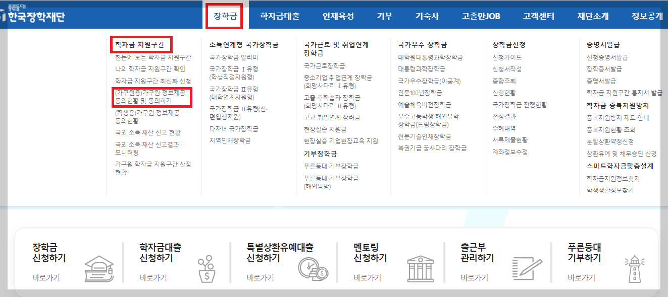 2. 상단 메뉴에서 [장학금] - [학자금 지원구간] - [가구원(부모 또는 배우자) 정보제공 동의 하기[ 클릭