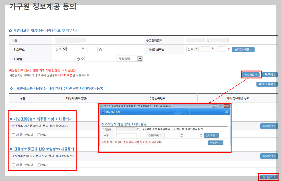 - 동의대상자 정보 직접입력 > 동의디상자(신청자) 선택 > 개인정보 및 금융정보 제공 동의 박스 체크 > 동의완료(공동/금융/민간인증서 활용)