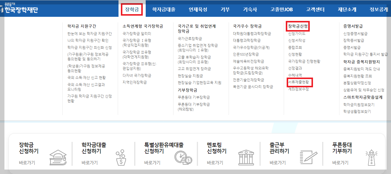 2. 홈페이지 서류제출 : [장학금] - [장학금신청] - [서류제출현황] - "서류제출" 클릭 후 해당 서류 파일 업로드