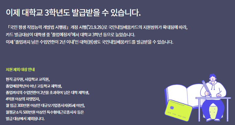 국민내일배움카드는 공무원, 사립학교 교직원, 졸업까지 수업연한이 2년이 초과하여 남은 대학생 및 졸업예정자가 아닌 고등학생, 연 매출 1억 5천만 원 이상의 자영업자, 월 임금 300만 원 이상인 대규모기업 근로자, 월 소득 30만원 이상인 특수형태근로종사자, 만 75세 이상자 등을 제외하고 국민 누구나 지원이 가능합니다.