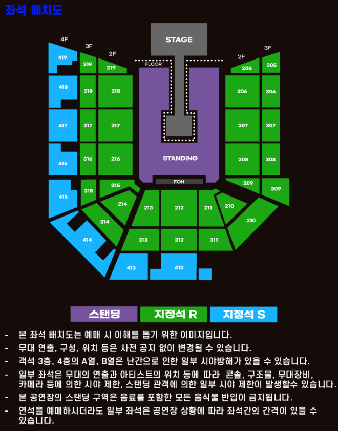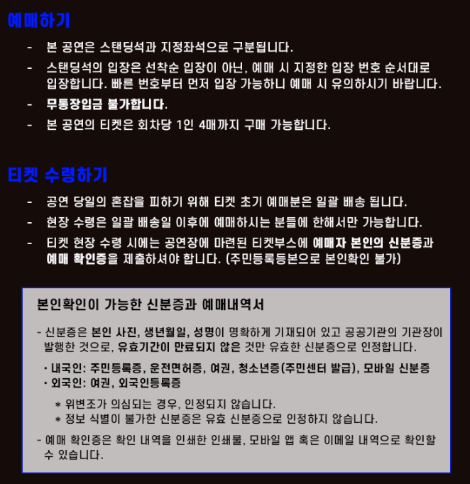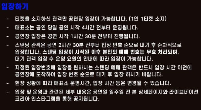 - 티켓 가격 : 스탠딩석 132,000원 / 지정석 R석 132,000원 / 지정석 S석 110,000원