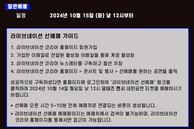- 2024년 10월 14일(월) 12:00 / 라이브네이션 선예매