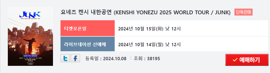 요네즈켄시의 내한 티켓팅은 10월 14일(월) 낮 12시 라이브네이션 선예매가 진행되었으며, 10월 15일(화) 낮 12시부터 인터파크 티켓 사이트에서 티켓 오픈이 시작됩니다. 1회 차에 1인 4매 예매가 가능합니다.