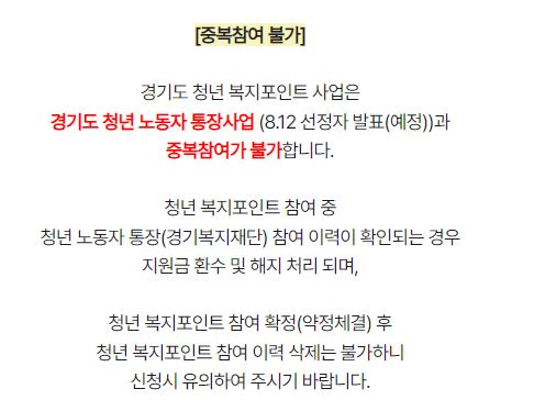 단, 경기도 청년 복지포인트 사업은 경기도 청년 노동자 통장사업(8.12 선정자 발표(예정))과 중복참여가 불가합니다. 청년 복지포인트 참여 중 청년 노동자 통장(경기복지재단) 참여 이력이 확인되는 경우 지원금 환수 및 해지 처리 되며, 청년 복지포인트 참여 확정(약정체결) 후 청년 복지포인트 참여 이력 삭제는 불가하니 신청 시 유의하여 주시기 바랍니다.