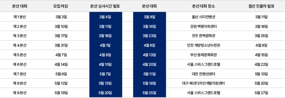 - 3차 : 결선대회 : 2024년 6월 29일(토) 인스파이어 엔터테인먼트 리조트(인천 중구 운서동)